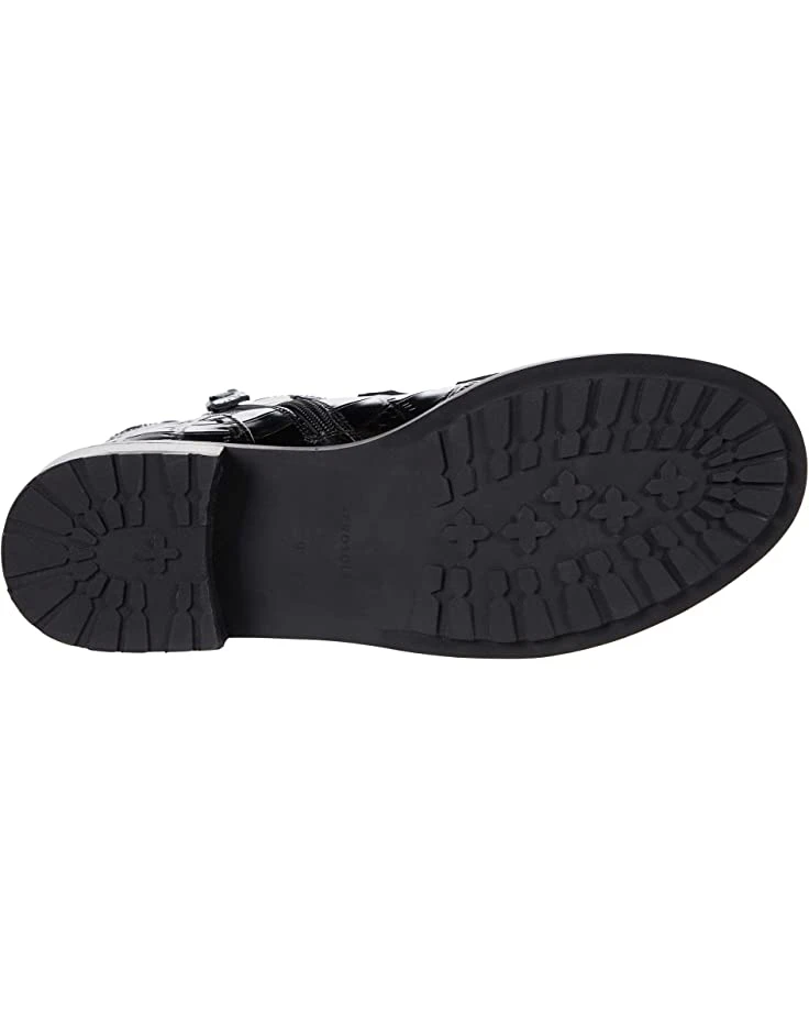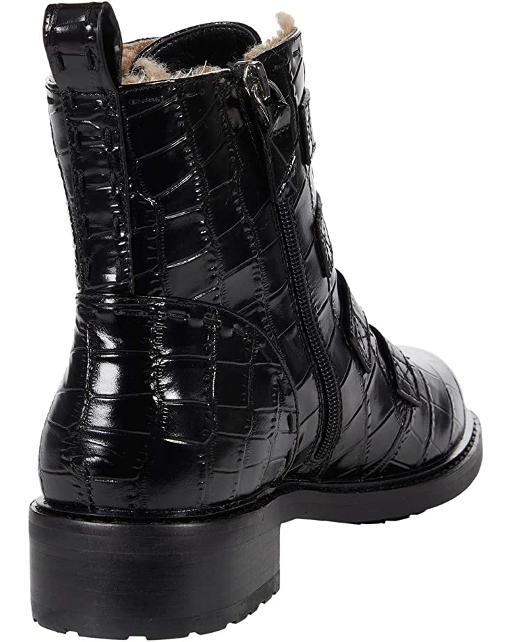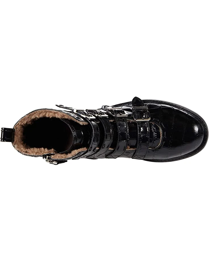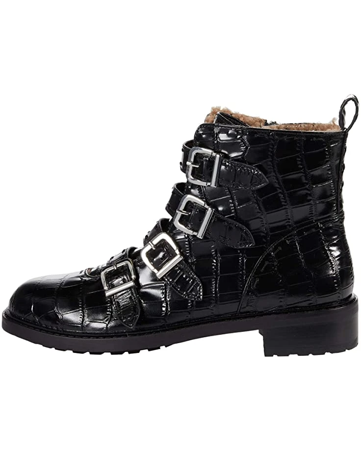 - Pearlescent croc skin-embossed leather upper is accented with decorative straps and chrome buckles along the shaft.