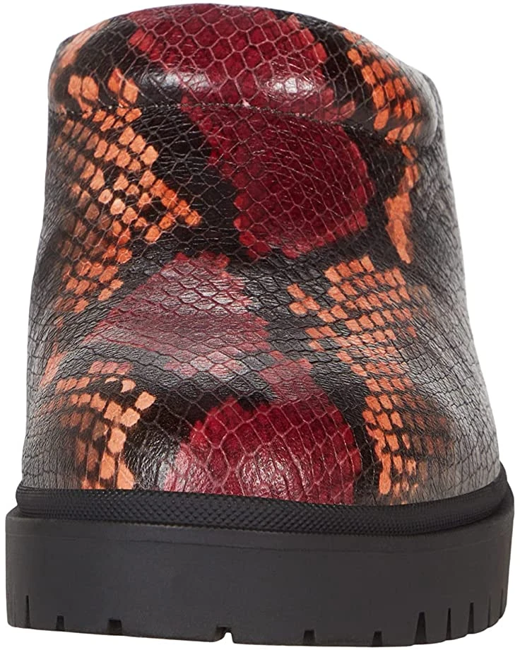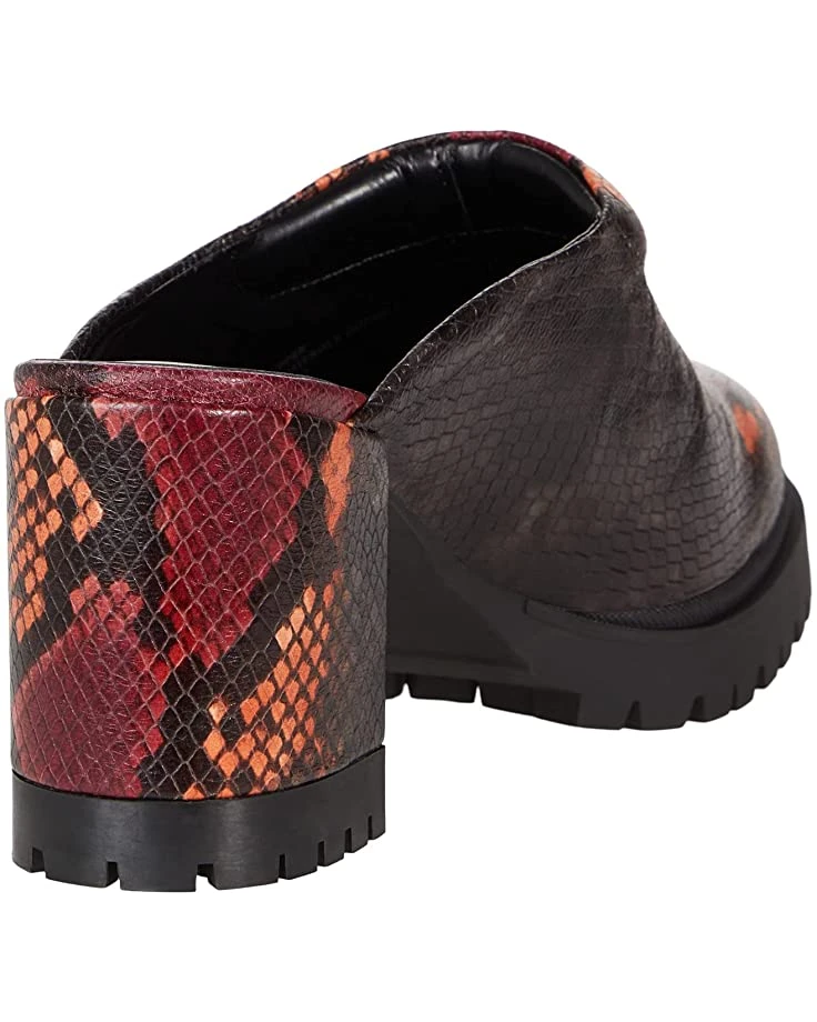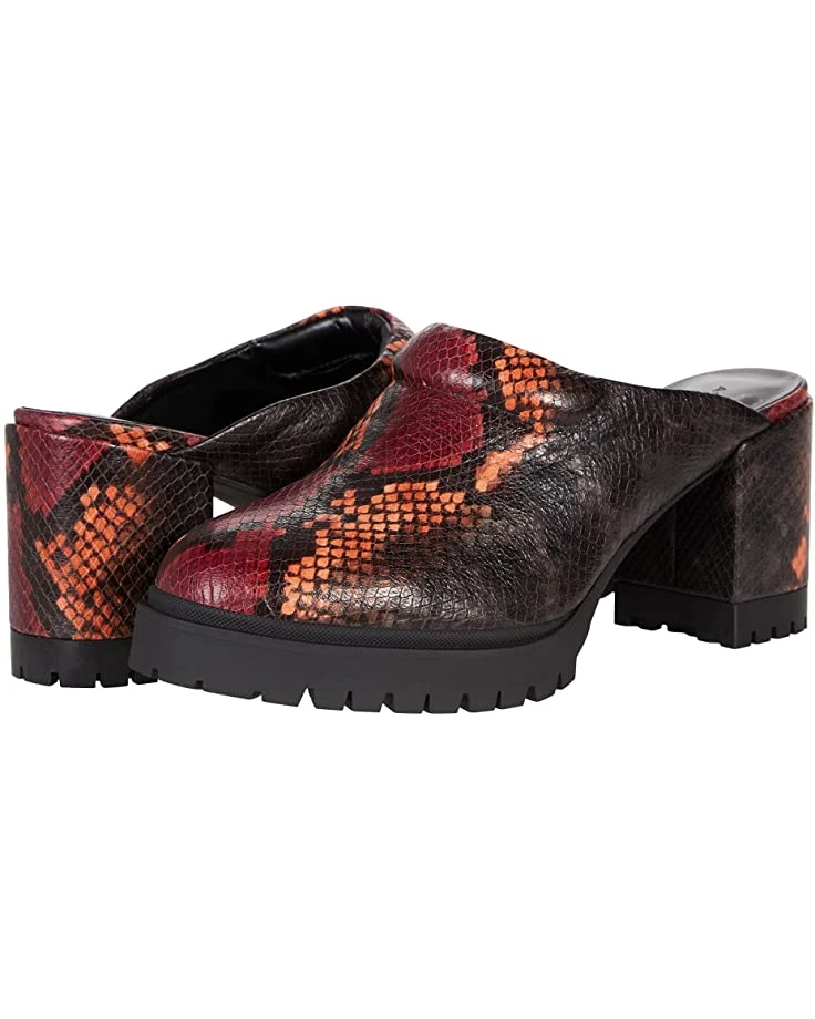 - Mule silhouette with platform sole and block heel.
