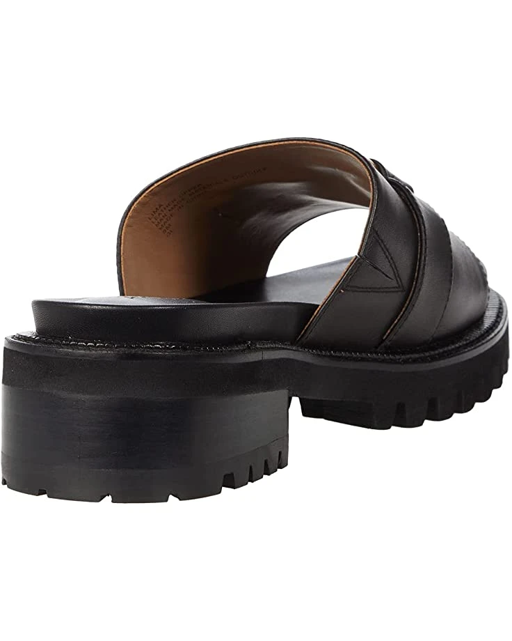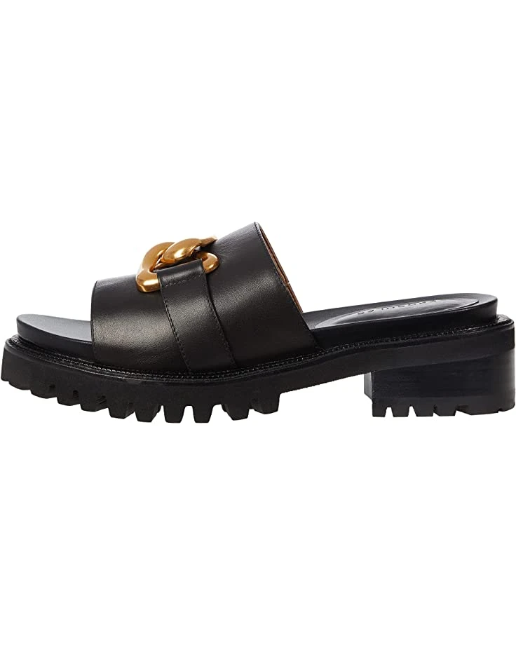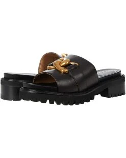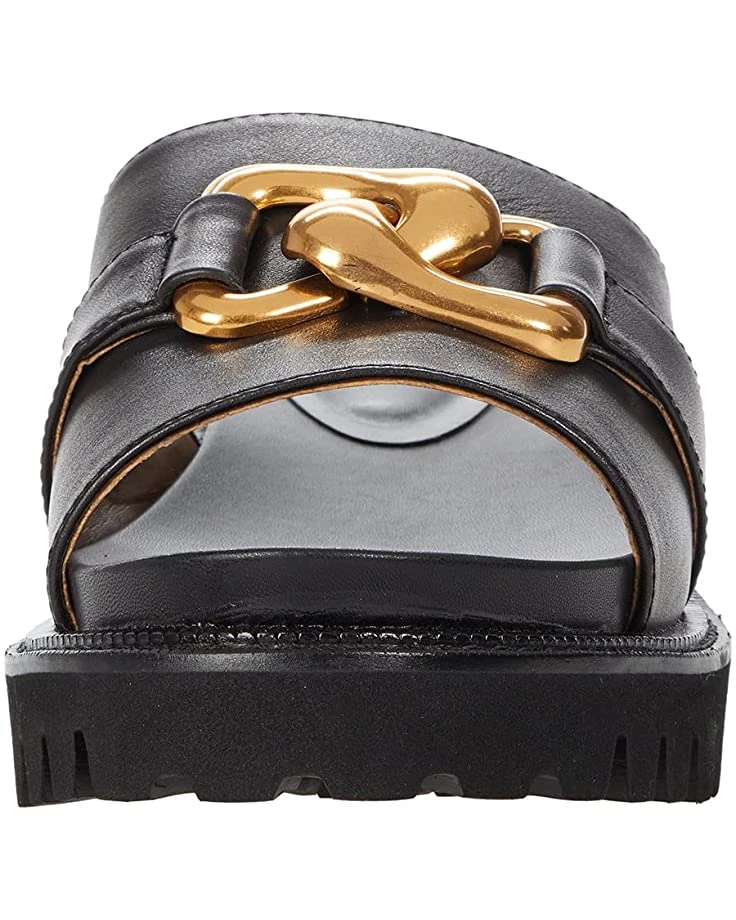 - Open toe silhouette with gold toned hardware detail on the vamp.